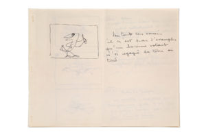 Queneau avaient déjà collaboré à un court métrage d'animation sur la naissance de l'automobile, Teuf-Teuf, en 1956. L'équipe se réunit à nouveau pour ce Bang Bang, consacré aux débuts de l'aviation. Queneau imagine que c'est un oiseau qui parle et retrace toutes les étapes qui ont conduit les hommes à pouvoir se déplacer dans les airs : « L'homme, je l'ai observé pendant des siècles. Il n'a jamais été capable de faire face à une situation concrète. Il a toujours eu le goût de l'évasion. L'existence a ses charmes, eh bien pourtant il rêvait de quitter tout cela et de voler loin.. loin... loin... » Queneau passe ainsi en revue les rêves de machines volantes depuis Icare jusqu'à Restif de la Bretonne, en passant par Cyrano de Bergerac. Puis il marque les grandes dates qui ont marqué l'histoire de la navigation aérienne : Pilâtre de Rozier, Felix du Temple, les frères Wright, Santos-Dumont, jusqu'à Lindbergh. Le dossier comprend également le découpage du film avec story-board dessiné par Jean JABELY (11 p.) ; le tapuscrit du commentaire de Queneau (5 p. in-4, plus 2 copies carbone ; 3 copies dactylographiées de la dernière page du scénario, avec un paragraphe supplémentaire ; une note manuscrite donnant à Queneau des renseignements techniques ; une page de dessins à la plume de Queneau représentant des fusées. On joint le dossier de Teuf-Teuf (court métrage de Jean Jabely, commentaire de Raymond Queneau, 1956) : tapuscrit corrigé (4 p. in-4) ; découpage avec description des images en vis-à-vis du commentaire (6 p. in-4 dactyl.) ; 4 lettres de la production (Les Films Armorial) adressées à R. Queneau (août-septembre 1956). Ce documentaire raconte les origines et les débuts de l'automobile, depuis la préhistoire jusqu'au moteur V8. Raymond Queneau a agrémenté ce texte didactique de traits d'humour bien à lui. Ainsi dans l'introduction : « Comme l'a dit Karl Marx, l'exploitation de l'homme commence toujours par l'exploitation de la femme. Quoique parfois encore pratiqué de nos jours, ce moyen de locomotion s'avéra insuffisant. L'homme chercha d'autres aides choisis également dans le règne animal, et de préférence plus dociles »...