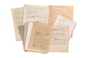 1946 à 1965. Le recueil Le Chien à la mandoline, publié en 1965 chez Gallimard, rassemble, en les augmentant de poèmes inédits, deux recueils de 1958 : Le Chien à la mandoline, publié par les éditions Temps Mêlés à Verviers, et les Sonnets publiés par les éditions Hautefeuille ; quelques poèmes avaient paru antérieurement dans des revues. Ce recueil marque une étape essentielle dans son écriture poétique, recourant à des formes classiques, comme le sonnet et l'alexandrin, pour en faire jaillir un contenu nouveau, à la fois libre, populaire et féerique. Les règles classiques du vers et du sonnet sont envisagées comme des protocoles pour les formes d'écriture les plus inattendues, absurdes mais aussi d'une extraordinaire fécondité comique. Les Sonnets, publiés la première fois en 1958 (cette première édition n'en contenait que 34), montrent combien Queneau trouva dans cette contrainte formelle, non pas un carcan, mais un espace lui permettant une grande variété de tons, et une étonnante création verbale, mêlant le calembour, l'orthographe phonétique, les jeux de mots, les distorsions et inventions de mots les plus incongrues, utilisant l'argot, des mots obscènes et crus, dans une ivresse verbale qui n'exclut pas le scepticisme et l'angoisse. Plusieurs de ces poèmes furent mis en musique et interprétés par les voix les plus marquantes de la chanson française, de Juliette Gréco à Catherine Sauvage, en passant par les Frères Jacques. Le présent dossier rassemble 92 poèmes autographes sur les 120 du recueil, où cinq d'entre eux n'ont pas été retenus. Sur les 87 poèmes retenus, 45 se rattachent au Chien à la mandoline (sur les 71 que contient cette première partie) et 42 aux Sonnets (sur 49). Cinq sonnets n'ont pas été conservés dans l'édition ; ils ont été publiés dans la section « Sonnets écartés des Sonnets de 1958 » au tome I des Œuvres complètes dans la Bibliothèque de la Pléiade. Citons au hasard le début du seizième sonnet, ici intitulé Cette odeur d'escalier... : « C'est métro c'en est trop oui c'est le politain son odeur d'haricots me monte à la cervelle grâce à lui je pourrai touriste parisien circonvenir Paris d'Auteuil à la Chapelle »... La plupart de ces poèmes présentent des variantes fort nombreuses avec leur version définitive de 1965. Nous renvoyons par un numéro à l'ordre des poèmes dans le recueil de 1965, numéro précédé d'un S pour les Sonnets, et pour les sonnets écartés à l'édition de la Pléiade. * Un cahier d'écolier petit in-4 (22 x 17 cm) à grands carreaux, à couverture rose portant la mention autographe répétée « Poésies », de 20 ff. et contenant 20 sonnets, à l'encre noire, avec certains titres ajoutés au crayon (titres souvent différents de l'édition), très corrigés (plus de 180 ratures, dont de nombreux vers biffés et réécrits). Les cheveux du géologue [S6 La Terre hémoroïsse] « Les esprits qui, sans fer, affrontent les appâts »..., Entre les pavés de la cour de Rome [écartés p. 823 Une petite fleur bleue qui pousse - pourquoi pas ? - du côté de la Gare du Nord] « Aboulez la monnaie, a dit la primevère »..., Le fin du fin [S2 Qui cause ? qui dose ? qui ose ?], Une révolution loupée [S7], Un maître humaniste [écartés p. 826 Les petits chemins que prennent les bûcherons dans la montagne] « Nous irons après toi dans les souches premières »..., Nouvelle découverte des Arabes à Puteaux [S13], Écrit plusieurs semaines avant le couronnement d'Elisabeth II d'Angleterre [S15], Cette odeur d'escalier... [S16 Singulière coïncidence d'une rime et d'un prince], Image tordue, nullement ressemblante d'un Albert [S14], En Avril ne découvre qu'un Soleil [S17], « Pignon sur rue et pignon au cul voilà bien »... [S18 Le temps des oiseaux], Les Sodomites Convertis [S20], Éléments et Principes d'un Idéalisme Solaire [écartés p. 822], « Le crapaud qui venait tous les soirs hululer »... [S19 On connaîtra maintenant les avatars de ce batracien], Mon adolescence immédiatement présente [écartés p. 825], « Après vous après toi après qui en ont-ils »... [S21 Voilà que j'assiste à un grand dîner officiel], « Je ne dormirai plus sous les ombres premières »... [S22 La culture du champignon sur les îlots solitaires], La pharmacie où la légende veut etc. [S23 Il y a dans la rue Saint-Honoré une pharmacie] « Ces pavés de Paris ne sont plus aussi gris »..., « Ce n'était pas une altercation mais enfin »... [S25 Se battre en silence c'est encore le mieux], « Je suis las de nourrir un aigle pour lui-même »... [S26 Prométhée plus ou moins bien enchaîné]. * 8 bifeuillets petit in-4 arrachés d'un cahier d'écolier à grands carreaux (22 x 17 cm), à l'encre noire, contenant 15 poèmes, quelques-uns titrés, comportant une centaine de corrections a
