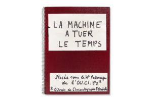 (ouvroir de littérature potentielle), créée en 1974. Comme son nom l'indique, il s'agissait d'appliquer au domaine cinématographique les recherches formelles dont l'Oulipo se servait pour la création littéraire. Le dossier comprend : * Cahier à spirales (32,5 x 23,5 cm) de 42 pages chiffrées avec chacune une photo originale en noir et blanc (11 x 18 cm) correspondant à chaque plan du film, accompagnée de sa légende dactylographiée. * Synopsis (13 p. dactylographiées avec une annotation manuscrite). * Plan du film (7 p. dactylographiées). * Préambule et 3 variations (8 p. dactylographiées). Le cahier porte un titre manuscrit au feutre noir inscrit sur 2 étiquettes : « La Machine à tuer le temps. Placée sous le haut patronage de l'OU. CI. PO * (* OUvroir de CInématographie POtentielle). Ce scénario est une de ses rares productions. L'œuvre repose sur un principe semblable à celui des Exercices de style : prendre un sujet anodin et le traiter de plusieurs façons, chaque fois en adoptant un genre cinématographique différent ou des procédés de trucage (accéléré, ralenti, répétition de plans, suppression d'images, etc.) Le Synopsis porte d'ailleurs le titre d'Exerstyle de cices suivi de la mention « (à débattre ? »). Les 42 photos originales du cahier à spirales présentent la trame du film : un carrefour parisien, des passants, un agent qui règle la circulation, un jeune homme lui demande un renseignement puis hèle une amie, les deux batifolent, elle lui donne un baiser sur la joue qui laisse une trace de rouge à lèvres. Ils regardent un beatnik chanter, un des spectateurs glisse sur une peau de banane. À la fin les deux jeunes gens s'éloignent enlacés, et la dernière image montre le garçon envoyant un baiser à sa compagne. Le dossier qui accompagne ces images explicite le travail proposé aux membres de l'Oucipo : « En se servant uniquement des images dûment répertoriées et inventoriées à l'annexe I, exécuter X... variations cinématographiques qui ne pourront être obtenues que par la seule modification du temps : c'est-à-dire : chronologie, durée - inversion - accélération - décélération - synchronisme - etc... etc... (étant entendu cependant que la bande sonore, quant à elle, pourra subir toute modification qui semblera désirable: parole - bruit - musique) ». Suivent plusieurs exemples possibles : le bouleversement de l'histoire par inversion des plans, la modification de leur durée par le montage, etc. On possède également trois synopsis de variations. Un pour une version « Abel Gance », avec la « ville tentaculaire », le « flic mis en croix au carrefour », « l'individu broyé écrasé sous les machines, piétiné par la foule ». La deuxième est une variation « antique », avec la foule prosternée devant l'agent de police-dictateur et le beatnik devenu poète lyrique. La troisième est une version « onirique », où grâce à des effets sonores toute l'action ressemble à un rêve. Il semble que Raymond Queneau, qui a encadré le passage et inscrit à côté la lettre « A » ait été tenté par la version « télégramme » ou « petite annonce ». On joint le tapuscrit d'un projet de scénario, L'Histoire du cinéma... à peu près comme elle a été (août 1951 ; 2 p. in-4, 2 exemplaires).