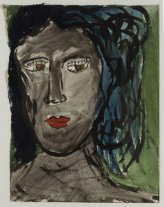 QUENEAU Raymond.Aquarelle gouachée, Tête de femme ; 33 x 25 cm. Visage féminin, à la chevelure noire rehaussée de bleu. La peau et le cou sont coloriés de brun, d'où ressortent l'éclat des yeux et les deux traits rouges des lèvres. Raymond...
