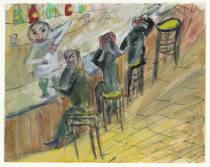 QUENEAU Raymond.Plume et aquarelle, Scène de bar ; 25 x 31,5 cm. Trois consommateurs sont assis au comptoir d'un bar derrière lequel officie un serveur vêtu de blanc. La peinture est composée selon une diagonale qui part du coin inférieur gauche...