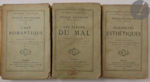 Volume des « Fleurs du mal » défraichi, en partie débroché, cassé au dos. Salissures et taches sur la couverture. Rousseurs. Le volumes des « Curiosités esthétiques » est incomplet du faux titre, du titre et du portrait, la couverture est légèrement salie. L'exemplaire de « L'Art romantique » est cassé au dos et avec des déchirures à la couverture.