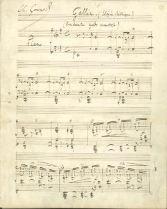 - un manuscrit autographe (1 page et quart petit in-4) à l’intention de Georgina WELDON pour son interprétation de Gallia à l’Opéra-Comique le 8 novembre 1871, en 3 points : « 1° Sur la ritournelle de la Cantilène, s’avancer à pas égaux sur le rythme de deux en deux temps ; puis s’arrêter avant la fin de la ritournelle, pour ne pas avancer trop loin »… Etc.