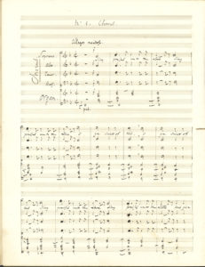 Vexilla Regis prodeunt. Catholic Hymn. Harmonized by Charles Gounod [CG 151], pour 4 voix mixtes et orgue (Condé p. 822), [décembre ? 1872]. Titre et 3 pages (découpées pour la gravure et recollées). Marquée Moderato maestoso, cette hymne est composée sur le texte latin ; Gounod a ajouté le texte anglais au crayon bleu : « O praise the Lord »…