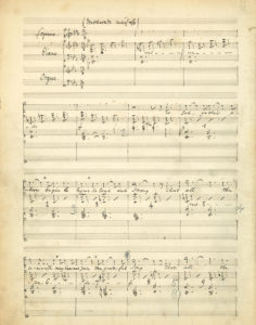 « Edition for Solo voice, Piano & winds Instruments », ainsi que le cachet encre Georgina Weldon for the Orphanage. L’effectif comprend flûtes, hautbois, clarinettes, bassons, cors en mi bémol et en ut, trompettes, 3 trombones, bass tuba, timbales, harpes et piano. À l’encre brune sur bifeuillets à 24 lignes, il présente quelques ratures et corrections ; il a servi de conducteur, comme en témoignent quelques annotations au crayon.