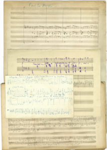 – 44 feuillets d’esquisses diverses : pour La Rédemption (« Les Saintes femmes au tombeau »), The Annunciation, George Dandin, la scène d’amour de Roméo et Juliette, un Kyrie, quatuors, mélodies, chœurs, etc.