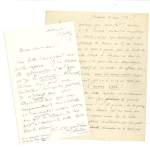 « Je sens bien que je t’aimerai toujours ; je t’aime à travers ta musique et j’aime ta musique à travers toi ! » Il espère que Paris acclamera Roméo en 1873. – Plus 2 notes autographes de GOUNOD : « Copie de mes conditions envers Mr Gye adressées à Barbier pour Roméo en 1872 à Londres », et un mémorandum concernant les conditions demandées à Gye pour la représentation de Roméo à Londres.