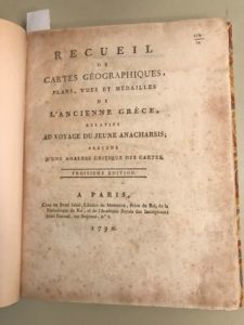 4.BARTHÉLEMY (Jean-Jacques). Recueil de cartes géographiques, plans, vues et médailles de l’Ancienne Grèce, relatifs au Voyage du jeune Anacharsis, précédé d’une analyse critique des cartes. A Paris, Chez De Bure, Libraire, 1790. In-4°, bradel, cartonnage moderne.