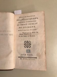 70.MABLY (Gabriel BONNOT DE). Des principes des négociations, pour servir d’introduction au droit public de l’Europe, fondé sur les traités. La Haye, 1747. In-12, basane, dos à nerfs orné (reliure de l’époque).