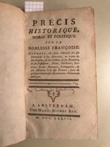 80.[NOBLESSE – TOUSTAIN DE RICHEBOURG (Charles Gaspard de)]. Précis historique, moral et politique sur la noblesse françoise. Ouvrage, ou?[…], on traite de son origine, de son utilité, de ses nuances, de ses possessions?[…] suivi de quelques lettres sur des matieres d’économie politique. A Amsterdam, Chez Marc-Michel Rey, 1777. In-12, demi-vélin ivoire à coins (reliure fin XIXe s.).