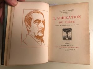 152.BARRÈS (Maurice). L'Abdication du poète. Paris, Georges Crès et Cie, 1914. In-12, demi-maroquin brun à coins, filet doré bordant les plats, dos à nerfs orné de caissons, tête dorée, couverture conservée (G. Levitzky). 40/50