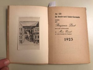 184.PÉRET (Benjamin). Au 125 du boulevard Saint-Germain, conte. S. l., 1923. In-8° broché, couverture illustrée.