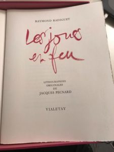 187.RADIGUET (Raymond). Les Joues en feu. S. l., [Paris], Vialetay, n. d. [1974]. In-folio en feuilles, sous couverture illustrée et boîte-étui rose de l’éditeur.