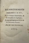 BAUDEAU (Nicolas) — Eclaircissements demandés à M. N** [Necker], sur ses principes économiques, et sur ses projets de législation ; au nom des propriétaires fonciers et des cultivateurs françois. S.l.n.n.,