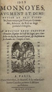 GRIMAUDET (François) — Des monnoyes, augment et diminution du pris d’icelles.