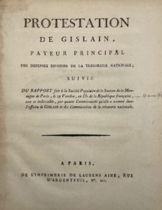 GISLAIN. Protestation de Gislain, payeur principal des dépenses diverses de la Trésorerie nationale. Paris, Laurens aîné, s.d. [1794]. In-4, bradel demi-chagrin à long grain, dos orné de petits fers révolutionnaires, titre en long (Honnelaître). Édition originale de ce mémoire dirigé contre les Commissaires de la Trésorerie nationale. Lavoisier, en particulier, est largement pris à partie. Gislain, qui était payeur principal de la Trésorerie nationale, examine en détail ses revenus et accuse le chimiste de cumuler les deux traitements de Commissaire à la Trésorerie et d’académicien. Tourneux, 10021.