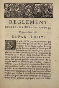 Description détaillée : 1. Règlement pour les épreuves des poudres. Du quatre Avril 1686. Paris, Chez la Veuve Saugrain, et Pierre Prault, Imprimeur des Fermes du Roy, 1730. 3 p.