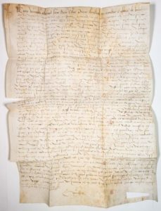 MAINE-ET-LOIRE. 1538. Prieuré de SAINT-AUBIN DE LUIGNÉ (49). Parchemin (69 x 49). En la Cour de la Sénéchaussée d'ANJOU, Sentence du 28 Janvier 1538, qui condamne Jean VILLAYS de payer au Prieur Claustral 3 Livres de rente due à cause d'une Maison sise rue SAINT-AUBIN. «Entre Vénérable et discret Frère René ECHER Prieur Claustral du Moustier et Abbaye de Sainct Aulbin d'Angers...»