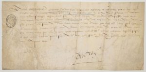 PICARDIE. 1558. Quittance signée Anthoine DUCROS l'un des vingt Capitaines appointés et entretenus par le Roy en PICARDIE, pour la personne du Sieur de CHATILLON, Seigneur et Colonel des Bandes Françaises, étant pour le Service audit Sieur audit Pays de Picardie. Fait le 7 Janvier 1558. Cachet du Cabinet d'Hozier. Vélin (14,5 x 29,5 cm)