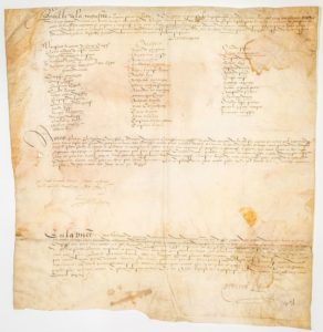 LOIRE. 1563. CHAZELLES-SUR-LYON. Rôle de monstre et revue fait à Chazelles en Foretz le 26 Janvier 1563 de 20 Hommes d'armes et 30 Archers sous la charge et conduite de Monsieur le Comte de BENE Capitaine. Parchemin (44 x 44 cm)