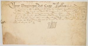 LANGUEDOC. 1570. Quittance signée de Dominique RIOLAS, Capitaine d'une compagnie de deux cents hommes de guerre à pied au service du Roi dans le gouvernement de Languedoc, sous les ordres du Maréchal Henri 1er, Duc de Montmorency-Damville, (Gouverneur du Languedoc). 20 Juillet 1570. Reçu Onze cents livres tournois pour sa Compagnie. Vélin (13,5 x 26 cm). Texte en Français.