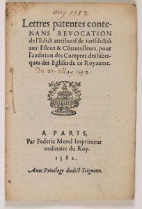 PARIS 1582.CLERGÉ. “Lettres patentes contenant Révocation de l'Édit attributif de juridiction aux Élus et Contrôleurs (Esleuz & Cotrerolleurs), pour l'audition des Comptes des Fabriques des Églises de ce Royaume” - du 21 mai 1582 - à PARIS par Frédéric Morel Imprimeur ordinaire du Roy. 1582; 8pp in-8°. Vignette.