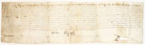 JURA. 1591. Collégiale de SAINT MAURICE de SALINS-LES-BAINS. Collation de la Chapelle ST DENIS, appartenant au Chapitre de ST MAURICE DE SALINS, Diocèse de BESANÇON, en May 1591. Parchemin en latin (17,5 x 64 cm)