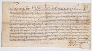Armand Jean de VIGNEROT du PLESSIS (Le Havre 1626 - 1718) Duc-Pair de RICHELIEU et de FRONSAC, Officier de Marine, Petit-Neveu du Cardinal de RICHELIEU. Pièce signée «Armand Duc du Plessis Richelieu» Paris 24 Avril 1677. Il nomme René JOUSSELIN l'un des Procureurs de son Duché de RICHELIEU (Indre-et-Loire) et de sa Baronnie de MIREBEAU, Procureur général et spécial de sa Baronnie de MIREBEAU (Vienne). Parchemin (20 x 40,5 cm)