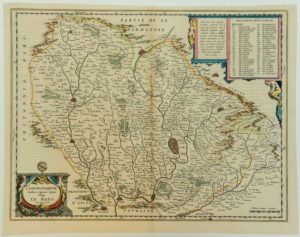 CARTE XVIIe du Diocèse du MANS. (SARTHE et MAYENNE): «Cenomanorum Galliæ regionis typus vulgo LE MANS.» Auct. Mathéo OGERIO. (Mayenne, Laval, Sablé, Le Mans, Domfront, Alençon, La Ferté-Bernard,...) (41 x 52,5 cm) Etat A. texte au verso. Coloris anciens.