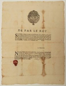 MAINE-ET-LOIRE. 1692. Convocation de la NOBLESSE DU DAUPHINÉ. Certificat signé PIERRE DE LOLLE Écuyer Sieur de FONTCHAUDE Commandant la Noblesse du DAUPHINÉ, certifiant le service de Mr DE MONTAULIEU Sieur de LIMANS Écuyer, qui a servi en 1692 dans le Ban et l'arrière Ban de la dite Province. Fait à SAUMUR (49) le 27 sept 1692. Sur l'Ordonnance Royale aux Gentilshommes du Dauphiné, convoqués pour l'Arrière-ban & envoyés au PONT DE CÉE, de partir de la Ville de SAUMUR où ils sont en quartier, pour retourner chez eux en bon ordre. 1page impr. (30 x 40) rempli à l'encre. Grande vignette royale, Cachet de cire aux armes (petites consolidations sans manque)
