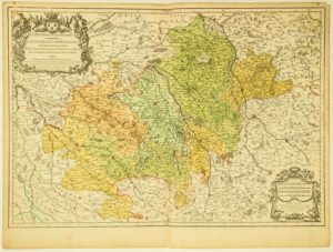 BERRY. CARTE de 1707: «Carte de la Province de BERRY. La Généralité de BOURGES, où sont les Élections de Bourges, d'Issoudun, de Châteauroux, du Blanc, de la Châtre, de St Amand et de la Charité. Dédiée à Messire Nicolas Estienne ROUJAULT, Chevalier,.. Intendant en la Province de Bourges.» Par Hubert JAILLOT Géographe ordinaire du Roy. (52 x 69,5 cm) Etat A.