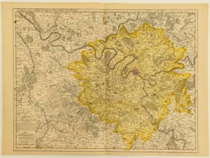 RÉGION PARISIENNE. CARTE de 1711: «Carte de la Prévôté et Vicomté de PARIS. Par Guillaume DE L'ISLE premier Géographe du Roy, de l'Académie royale des Sciences.» A Paris, chez l'auteur sur le quay de l'Horloge, avril 1711.» (Paris, Sceaux, Corbeil, Lagny, Dammartin, Écouen, Sevran, Argenteuil, l'Ile Adam, La Roche Guyon, Houdan, Versailles, Ablis, La Ferté Alais... ) (53 x 71,5 cm) Etat A