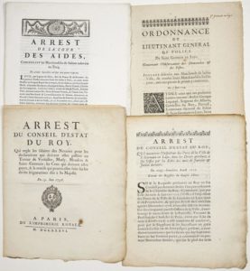 (YVELINES) 4 Imprimés: “ARREST du Conseil d'Estat du Roy, qui maintient l'Inspecteur des PORCS …