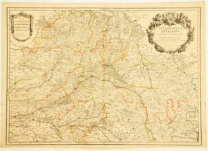CARTE de 1719: «La Généralité d'ORLÉANS, divisée en ses Élections. Dédiée à Messire Jean de CREIL, Chevalier, Marquis de CREIL-BOURNEZEAU Intendant de la Généralité d'Orléans.» Par Hubert JAILLOT Géographe ordinaire du Roy, 1719.» (Blois, Vendôme, Châteaudun, Chartres, Dourdan, Pithiviers, Orléans, Romorentin, Beaugency, Bourges, Clamecy, Gien, Montargis,...) (54 x 75,5) Etat B+