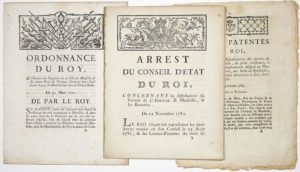 (BOUCHES DU RHÔNE). 3 Imprimés: (PESTE DE MARSEILLE) - “Ordonnance du Roy, qui permet aux Négociants de MARSEILLE & des autres Ports de Provence, d'envoyer leurs Vaisseaux dans les Ports d'Italie.” Du 30 Mars 1722 - Bandeau Marine - Impr. royale, 3pp in-4° +“ARREST du Conseil d'État du Roi, concernant la distribution du Terrain de L'ARSENAL de MARSEILLE, et les Reventes.” Du 12 Nov. 1782 - Bandeau - Impr. à MARSEILLE 12pp in-4° + “LETTRES PATENTES DU ROI, Qui permettent aux adjudicataires des terrains de l'Arsenal de MARSEILLE, de faire construire, à leurs frais,... une Salle de Spectacles, de laquelle la propriété demeurera à eux, leurs hoirs & ayant causes.” - du 27 Janvier 1785 - Bandeau - Imprimé à AIX, 4pp in-4°.