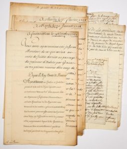 SÉNÉCHAUSSÉE DE GRASSE (06) 1728. MEURTRE. Dossier de 11 pièces in-4 et in-folio: Précis de la procédure faite en la Sénéchaussée de GRASSE contre le Sieur D'HANTECOURT Lieutenant au Régiment d'AUNIS au sujet du meurtre commis en la personne de Joseph Hugues Muletier de ladite Ville qui y avait été commandé par les Consuls dudit Grasse pour porter avec son mulet et son cheval les équipages dudit Régiment. Détenu 4 mois dans la Prison de DIGNE (04).