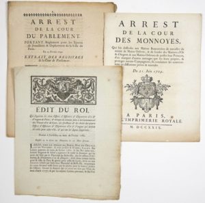 Paris. ORFÈVRERIE. 3 Imprimés: “Arrest de la COUR DES MONNOYS, qui fait défenses aux Maîtres BOUTONNIERS de travailler du métier de Maître ORFÈVRE, & de fondre les Matières d'Or et d'Argent; & aux Maîtres Orfèvres de prêter leur poinçon, d'en marquer d'autres ouvrages que les leur propres, & protéger aucuns Compagnons; et condamne les contrevenants en différentes peines et amendes.” - du 21 Juin 1729 - Impr. à PARIS, de l'Imprimerie Royale, 1729; 8pp in-4°. + (JOAILLERIE & ORFÈVRERIE) “Arrest de la Cour du Parlement, portant Règlement pour les Épaves de Jouaillerie & Orphevrerie de la Ville de PARIS.” - du 25 Février 1747 - Impr. à Paris, chez Prault, 4pp in-4°. + (AFFINEURS D'OR DE PARIS) “Édit du ROI, qui supprime les deux Offices d'Affineurs & Départeurs d'Or & d'Argent de PARIS; & révoque la réunion faite à la Communauté des Tireurs d'Or de LYON, des fonctions et des droits des quatre Offices d'Affineurs & Départeurs d'Or & d'Argent qui avaient été créés pour cette ville, & qui ont été depuis supprimés.” - Données à VERSAILLES au mois de Février 1781 - Impr. à PARIS, de l'Imprimerie Royale, 1781, 4pp in-4° - Bandeau - “... le feu Roi... a approuvé la donation qui lui avait été faite par le Maréchal de BELLE-ISLE, des 6 Offices d'Affineurs & Départeurs d'or et d'argent, dont deux étaient établis pour la Ville de PARIS & quatre pour celle de LYON... le feu Roi a fait don à l'École Militaire desdits 6 Offices...”.