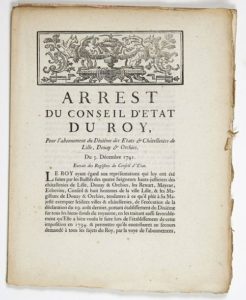NORD. 2 imprimés: Arrest du Conseil d'État du Roy, pour l'abonnement du dixième des États & Châtellenies de LILLE, DOUAY & ORCHIES. Du 5 Décembre 1741. à Paris, de l'imprimerie royale, 1742. Bandeau aux dragons. + “Lettres Patentes sur Arrêt portant réunion de Biens de Fondations particulières à l'Hôpital Général de la Ville de LILLE.” Du 2 Avril 1744. De l'Imprimerie de la Veuve de C.M. CRAMÉ, 1745, Impr. 14pp in-4°. Vignette, Bandeau & Lettrine.