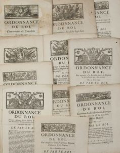 ARMÉE ROYALE. 11 IMPRIMÉS. Ordonnances des Rois LOUIS XV et LOUIS XVI de 1743 à 1776, in-4° et in-folio, Impr. à Paris, de l'Imprimerie Royale (sauf un) - Bandeaux décoratifs. Qqs défauts, savoir: 10 Août 1743. Pour augmenter d'un Bataillon chacun des Régiments de son Infanterie qui y sont nommés.+ 30 Janvier 1746. Portant création d'un corps de cinq cents hommes de troupes légères, sous le nom de Volontaires de Gantés. + 8 Nov. 1766. Concernant les Invalides logés hors de l'Hôtel. + 1er Juillet 1768. Portant règlement sur les Voitures qui doivent être fournies aux Troupes pendant leurs marches. Impr. à AIX (13) + 1er août 1770. Pour régler le nombre des Officiers de ses Troupes de Cavalerie, Hussards & Dragons qui auront congé de semestre. + 25 août 1771. Pour régler le nombre des Officiers de ses Troupes de Cavalerie, Hussards & Dragons qui auront congé de semestre. + 12 Déc. 1775. Portant Amnistie générale en faveur des Soldats, cavaliers, dragons & Hussards, qui ont déserté des Troupes de Sa Majesté, avant le 1er Janvier 1776: Et qui établit de nouvelles peines contre les Déserteurs. + 25 Mars 1776. Ordonnance du Roi concernant la Cavalerie. (Défaut) + 17 Mai 1776. Concernant les dispositions relatives au Passage, Séjour & logement de ses Troupes, & la manière d'y pourvoir . + 31 Mai 1776. Concernant l'administration des fourrages pour les chevaux de la Cavalerie, Dragons & Hussards. + 12 sept. 1776. Pour changer les noms de quelques Régiments d'Infanterie & de Dragons.