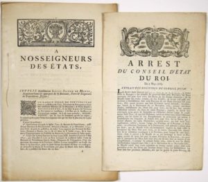 ÉTATS DE BRETAGNE. (LOIRE-ATLANTIQUE). 2 Imprimés: (BARONNIE DE PONTCHÂTEAU) Imprimé 11 pp grand in-folio - Supplique de Louis-Joseph DE MENOU, Acquéreur banni & approprié de la Baronnie, Terre & Seigneurie de PONCHÂTEAU, à Nosseigneurs des États (de BRETAGNE) - Il leur demande de prendre possession du Titre, Honneurs & Prérogatives de la Seigneurie “il se flatte que sa Naissance ne l'en rend pas indigne.” Il présente son contrat d'acquêt de ladite Terre & Baronnie de PONTCHÂTEAU, passé devant Notaires à NANTES, le 30 Décembre 1743 - on lira à la suite les pièces justificatives extraites aux registres du Greffe des États de Bretagne de 1603 à 1683... concernant Armand du CAMBOUT, Duc de COASLIN et son fils Pierre de CAMBOUT, Marquis de COASLIN, Baron de PONCHÂTEAU - Bandeau & Lettrine. + (PRIVILÈGES DE BRETAGNE) «Arrest du Conseil d'État du Roi du 3 May 1765.» suivi de l'ordonnance de RAUDIN Commissaire des Guerres en Bretagne, fait à RENNES le 8 Mai 1765 - Imprimé 4pp in-folio. Beau Bandeau gravé en-tête, aux armes royales. « Le Roi étant informé que...Le Parlement de Bretagne a fait défenses de percevoir dans cette Province, les deux nouveaux Sols pour livre en sus des Droits de ses Fermes Générales...» Le Roi déclare nulle «la Délibération prise le 10 du mois dernier, par les Négociants de NANTES...»