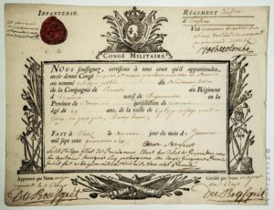 RÉGIMENT D'INFANTERIE D'ENGHIEN. 1746. CONGÉ MILITAIRE au nommé Philippe GILBERT Dit Brindamour Soldat de la Compagnie de PRUNÉLÉ natif de THIGNONVILLE (45). Fait à METZ (57) 2 Janvier 1746 - Pièce signée du Conseil du Régiment & de ROCHECOLOMBE Brigadier des Armées du Roy, Son Commandant au Gouvernement de METZ. 1p in-folio oblong, décorée d'armes - Cachet de cire du Régiment.