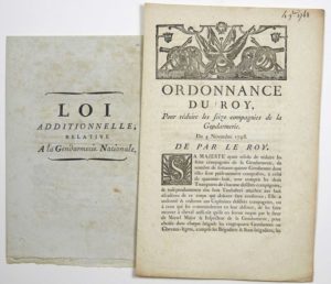 GENDARMERIE. 2 Imprimés: «Ordonnance du Roy, pour réduire les Seize Compagnies de la Gendarmerie.» 4 nov. 1748. Bandeau aux canons & lettrine. Impr. 2pp in-4° + “ Loi Additionnelle relative à la Gendarmerie Nationale.” 20 juillet 1791 - “.. quelques articles additionnels nécessaires à la prompte organisation de la Gendarmerie Nationale.” En 10 articles. Imprimé 8pp in-4° - Titre, bandeau & lettrine.