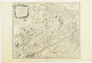 CARTE de 1749: «Partie septentrionale du comté de BOURGOGNE ou FRANCHE-COMTÉ, où sont les Bailliages de Vesoul, Gray, Besançon, Baume, le Comté de Montbéliard et partie des Bailliages de Dole, Quingey et Ornans, par le Sieur ROBERT Géographe ordinaire du Roy, avec privilège, 1749.» (50,5 x 74,5 cm) Etat A