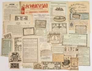 COMMERCE. PUBLICITÉ . Collection de 30 Petites réclames de Commerçants gravées, Cartes de Visites et Tarifs de commerçants, Ex-Libris & Papiers divers XVIIIe, XIXe: FESTE RENAUDIN Ferblantier Lampiste à Troyes + Usage de l'Eau féconde + Demander La Chronique Parisienne + Melle LALLEMAN, de Lille, Marchande de Dentelles + Tarif «A LA BARBE D'OR ET AU JOCKEY», Magasin de Draps réunis, rue Vivienne N°39 + Avis sur les PEAUX DIVINES, remède contre les maux de tête + Avis GORINI Frères Opticiens, Joailliers, bijoutiers + Déballage de marchandises nouvelles + Tarif Léopold MOSSY, Gommes, Vanilles, Essence et matières premières de Parfumerie + Bandages Herniaires, par Brevet d'invention + PETIT, Tapissier, rue Montmartre + «AUX ENVIEUX DE LA VERTU», rue de la Verrerie, N°171, AUZOU Tient Magasin de papiers en gros.. + Minet CARON Coiffeur, Marchand Parfumeur + Cirage des Sieurs, LECLERCQ brevetés + «AU VASE D'OR» à Saint-Germain-en-Laye, BÉNARD Marchand Orfèvre + MARQUET M. Coffretier-Layetier + COURTOIS, à Lyon, Dentelles de Flandres, mousselines + HEUTE et FILS, fabrique à Honfleur, des Tabacs en carottes, Bitors pour chiquer.. + GRELET Coutelier à Lyon + MARTEAU Fabricants d'ornements d ‘Eglise à Lyon + Bertrand le jeune, Fabricant de chapeaux de paille de la Cour et de S.A.R. et I. la Princesse d'range + PALLUY Ferblantier-Lampiste à Paris +...