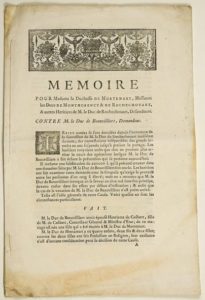 SUCCESSION DU DUC DE ROCHECHOUART. PROCÈS - “MÉMOIRE pour Mme la Duchesse de MORTEMART, MM. les Ducs de MONTMORENCY & DE ROCHECHOUART, & autres Héritiers de Mr le Duc de Rochechouart, Défenseurs. Contre M. le Duc de BEAUVILLIERS, Demandeur.” Grand Bandeau et Lettrine - Impr. 17pp gd in-folio, de l'Imprimerie de Paulus-Du-Mesnil, rue de la Vieille Draperie, 1756 - “Treize années se sont écoulées depuis l'ouverture de la succession de M. le Duc de Rochechouart troisième du nom; des contestation inséparables des grands intérêts en ont suspendu jusqu'à présent le partage... Fait..”