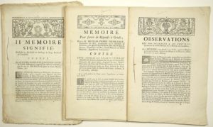 CAUDEBEC (76). 4 Imprimés: 3 Mémoires de procès de l'Imprimerie de VIRET à ROUEN (76), rue Sénécaux, de 1761: 1°) «OBSERVATIONS des sieurs DESMARES & DE FREVILLE, Lieutenant & Garde-Marteau de la Maîtrise de CAUDEBEC ; sur le Mémoire à eux signifié le 13 Juillet, requête de Mr LE CHARPENTIER, Seigneur de MARGAT, & de FLANCOURT, Maître particulier en ladite Maîtrise.» - Impr. 12 pages grand in-folio + 2°) «MÉMOIRE pour servir d'instruction dans la cause qui se plaide au Siège-général de la Table de Marbre, pour Nicolas pierre DESMARES, Conseiller du Roi, Lieutenant-particulier en la Maîtrise des eaux et Forêts de CAUDEBEC, & Jean-Baptiste DE FREVILLE, Ecuyer, Conseiller du Roi, Garde-marteau... Contre Nicolas LE CHARPENTIER DU MARGAT, Ecuyer, Maître Particulier en ladite Maîtrise.» - Impr. 12 pages grand in-folio + 3°) «MÉMOIRE pour servir d'instruction dans la cause qui se plaide au Siège-Général de la Table de Marbre, pour Me Nicolas Pierre DESMARES...» - Impr. 13 pages grand in-folio + (Mémoire de procès de 1746) - «2ème Mémoire Signifié, pour les Juges du bailliage et Siège Présidial de CAUDEBEC (76) ; Contre les Auteurs, complices & distributeurs du Libelle diffamatoire, imprimé & distribué au Public, sous le titre de MÉMOIRE pour le sieur DUVAL, Prêtre, & c.» - Imprimerie de VIRET, près S. Martin (à ROUEN).