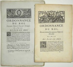 RÉGIMENT D'INFANTERIE. 2 Imprimés: “Ordonnance du Roi portant création d'un Régiment d'Infanterie IRLANDAISE” du 14 mai 1776, en 12 articles - “4).Sa Majesté se réserve la nomination des Officiers dudit Régiment; son intention étant que ceux qui composaient le régiment ci-devant de WALSH, y soient placés par préférence: elle fera d'ailleurs connaître les dispositions qu'Elle jugera à propos de cet égard.” - Impr. Royale 5pp 1/2 in-folio, Paris 1776 - Bandeau aux canons et Lettrine. + «Ordonnance du Roi concernant l'Infanterie Française et Étrangère.» Du 25 mars 1776. A Paris, de l'Imprimerie Royale, 1784 ; 20 pages gd in-folio.