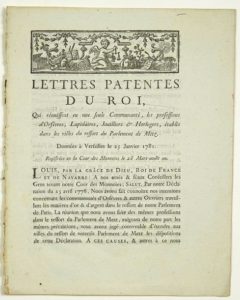 METZ (57). ORFÈVRES, LAPIDAIRES. 1781. «Lettres patentes du Roi, qui réunissent en une seule …