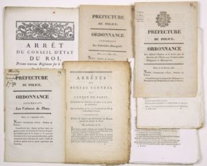 PARIS. DILIGENCES, CARROSSES & CABRIOLETS. 7 Imprimés: «Arrêt du Conseil d'État du Roi, portant nouveau règlement sur le ROULAGE. Du 28 Décembre 1783.» - Impr. à PARIS, de l'Imprimerie Royale, 6pp in-4° + “Arrêtés du Bureau central du Canton de PARIS, concernant les Carrosses de place et la Police des Cabriolets.” du 24 Fructidor an 6, et 9 vendémiaire an 7 - Imp. à Paris.. dépôt des lois, place du Carrousel, 24pp + 4pp in-8° - “Le Bureau central, informé que nombre de loueurs de carrosses de places exercent leur profession, sans avoir acquitté les droits dûs à la République; Que d'autres, ayant acquitté ces droits, se croyent suffisamment autorisés à faire stationner leurs carrosses sur la voie publique, et se dispensent de se pourvoir d'une permission du Bureau central, qui se peut leur accorder cette faculté à des conditions qui en sont le prix;...” + «Ordonnance de Police qui défend l'Entrée et la Sortie pour la Barrière de l'Étoile aux Voitures dites diligences et Messageries.» Paris 26 Février 1830 - Impr. Lottin de S. Germain ; 4pp in-8° + «Ordonnance de Police concernant les Cabriolets Bourgeois.» Paris 21 mars 1831. Impr. Lottin de S. Germain ; 6pp in-8° + «Ordonnance de Police concernant les Voitures de Place.» Paris le 5 Sept. 1831 - Impr. Lottin de S. Germain; 6pp in-8° + Bulletin des Lois N°344, in-8°. Ordonnance du Roi contenant les mesures de Police relatives aux Propriétaires ou Entrepreneurs de Diligences, de Messageries, ou autres Voitures publiques.» du 4 Février 1820 ; + Bulletin des Lois N°398, in-8°. «Loi sur la Police du Roulage et des Messageries publiques.» des 12, 30 Avril et 30 Mai 1851.