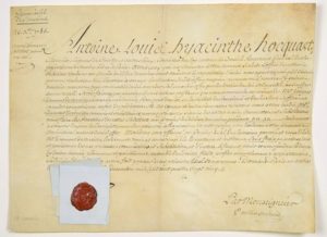 CHER. 1785. GRENIER À SEL de SANCOINS. Pièce signée Antoine-Louis-Hyacinthe HOCQUART Chevalier, Seigneur de CUEILLY & autres lieux, Conseiller du Roy, Procureur général (En-tête manus.) - Commission donnée à Jacques DUMONT DE VERVILLE Avocat en Parlement, de Substitut au Grenier à SEL de SANCOINS (18). Donné à Paris le 16 décembre 1785 - Vélin (32 x 24) - Sceau de cire aux armes.